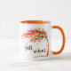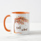 Tasse à café avec une aquarelle illustrant un arbre d'automne par un jour venteux avec souffle et chute des feuilles aux couleurs de l'automne. Le script Fall Vibes centré sous l'arborescence dans une couleur de police pour correspondre aux illustrations. L'image est répétée et inversée à l'arrière de la tasse. Autres couleurs de jante et de poignée disponibles. Autres styles disponibles.