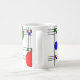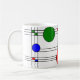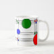 Cette tasse est décorée de vitraux art déco aux lignes noires et de carrés et cercles rouges, bleus et verts.