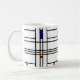 La tasse d'art moderne de Mondrian a une section comme la composition 10 par Pieter Piet Mondrian en rouge, bleu, jaune, noir et blanc, mieux la savoir du groupe de mouvement d'art de Stijl qui a employé trois couleurs primaires avec les lignes noires sur un arrière - plan blanc