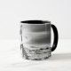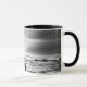 Mug avec une image en noir et blanc d'un surfeur se dirigeant vers un surf alors qu'il marche au-dessus des rochers avec planches de surf à la main.