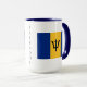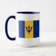 Drapeau de la Barbade. Le drapeau national de la Barbade a été officiellement adopté le 30 novembre 1966, premier jour de l'indépendance de l'île. Il se compose d'un tribande de deux bandes d'ultramarines, qui sont supposées représenter l'océan ; séparées par une bande médiane dorée, représentant le sable de l'île. Une tête de trident noire (communément appelée "trident cassé"), est centrée au sein de la bande d'or. Le symbole trident a été pris de l'insigne colonial de la Barbade, où le trident est montré avec Britannia en sa possession. La partie inférieure brisée symbolise une rupture symbolique de son statut de colonie. Les trois points du trident représentent les trois principes de la démocratie - 1) le gouvernement de, 2) pour, et 3) par le peuple.