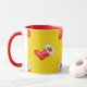 Une tasse de Noël colorée avec un motif festif de bas rouges de Noël éparpillé sur un arrière - plan jaune doré.