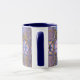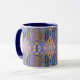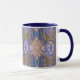 Cette tasse présente un style batik, d'inspiration tribale, en bleu, violet et jaune.