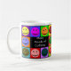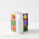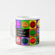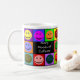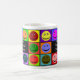 Cette tasse comporte 10 visages heureux colorés entourant l'expression "beaucoup de modes de la caféine" imprimée sur des côtés pour des gauchistes ou des righties !