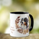 Une jolie couronne d'automne aux tons marron, brun brun brun, brun et crème entoure l'aquarelle d'un chien de montagne bernois. L'image est imprimée deux fois sur la tasse, avec votre texte personnalisé entre eux.