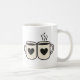 Mug en céramique blanche orné d'une illustration adorable et minimaliste représentant deux tasses côte à côte. Chaque tasse arbore un grand cœur noir sur un fond beige clair. La vapeur s'échappant de l'une des tasses ajoute une touche de chaleur. Ce design simple et mignon est parfait pour les couples, les amis, ou toute personne souhaitant exprimer son affection de manière ludique. Idéal pour partager un café ou un thé