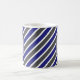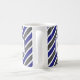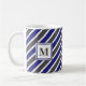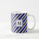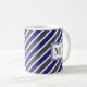 Tasse à café motif rayé diagonale en blanc, bleu foncé et gris avec monogrammes sur les deux côtés dans des couleurs assorties.