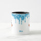 Cette tasse a un joyeux visage de bonhomme de neige de deux côtés. Le sommet est bordé de gouttes de parties scintillant bleu étincelant. Votre nom ou autre texte est situé entre les faces du bonhomme de neige. Mignonne pour Noël et tout au long de l'hiver.