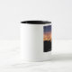 Un lever de soleil de matin au-dessus de la ville de Baltimore sur une tasse blanche avec l'équilibre noir sur la poignée et la jante.