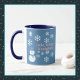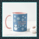 A Slice of Life and Delight présente Hello, Winter Wonderland des tasses à café combo avec un bonhomme de neige décoré de flocons de neige blancs, écriture rose, et un fond bleu. Les tasses à café bonhomme de neige ont également un casquette bleu et une écharpe.
