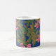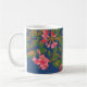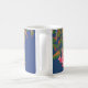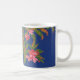 Un très joli café Mug très design, avec du japonais rose vif (coing japonais) sur un arrière - plan bleu profond ; à partir d'une sérigraphie de Judy Adamson.