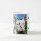 Rencontrez le Mackenzie, le bull-terrier anglais qui a tourné nos vies à l'envers et a volé nos coeurs dans le processus. Elle est toujours pleine de l'amusement et nous garde sur nos orteils. Elle est montrée en cette photo jetant un coup d'oeil par une certaine longue herbe verte. Ce chien adorable est décrit contre un beau ciel bleu un jour ensoleillé lumineux.