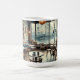 Un cadeau parfait pour les amateurs de voyage et de café. La peinture à l'aquarelle représente un café tranquille et solitaire de San Francisco avec un intérieur faiblement éclairé. Des tables et des chaises en bois vides sont soigneusement disposées, diffusant de douces ombres au sol. Des oeuvres d'art vintages défraîchies et un petit menu en damier ornent les murs, ajoutant un charme nostalgique. À travers une fenêtre mouchetée par la pluie, les rues désertes de San Francisco semblent bouchées sous un ciel couvert. Une seule tasse de café est posée sur une table près de la fenêtre, avec une légère traînée de vapeur qui monte dans l'air calme. Les coups de pinceau doux et une palette de bleus profonds, gris et bruns chauds évoquent une atmosphère tranquille et mélancolique, capturant parfaitement la solitude de la scène.
