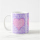 Une jolie tasse à café pour une personne spéciale avec trois panneaux contenant un coeur rose sur un arrière - plan bleu violet. Les mots "Je t'aime" sont écrits partout dans le design en lettres blanches.