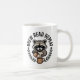 Illustration chaleureuse de style badge d'un raton laveur dans un petit tablier de barista qui verse du café à côté d'une pile de livres ouverts. L'expression "Brew Read Repeat" se trouve au-dessus, rendue en lettres de bloc conviviales et d'une teinte brun-café. Des remplissages vectoriels plats et des lignes nettes assurent que les imprimés d'oeuvres d'art sont clairement imprimés sur la céramique tout en procurant une énergie confortable de lecture et de café.