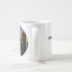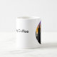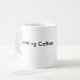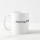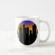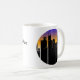 Une tasse blanche avec du "café de matin" écrit sur elle et une image stylisée d'aube se levant au-dessus d'une ville a imprimé sur la tasse aussi.