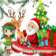Santa Claus, le petit elfe et le renne, et le café Arrière - plan de Noël