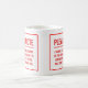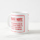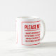 Tasse drôle pour un amant de café, avec un déni de responsabilité écrit dans les lettres rouges et audacieuses avertissant n'importe qui de parler au propriétaire de tasse avant qu'ils aient eu leur café.