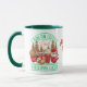Voici une mignonne tasse pour cette période trépidante juste avant l'arrivée de Noël ! Une image de style rétro de tasses de café rouge festif remplies à la brasserie a une ligne d'arbre forestier comme l'arrière - plan. Le texte vert ci-dessus et en dessous de l'image dit "Je cours sur Café et Noël Cheer". L'image est imprimée deux fois sur la tasse, avec "Joyeux Noël" et votre nom entre les images.