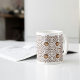 Cette tasse à café présente un design magnifiquement symétrique de tasses à café vapeur, de motifs tourbillonnants et d'accents de café, parfait pour quiconque croit que le café est une forme d'art.