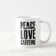 Peace Love Caffeine. Pour les amateurs de café. Lettres noires de style Grunge sur une jolie tasse en céramique blanche. Design par Marisu Valencia, copyright 2012.