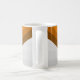 character wearing a cute, full-body pufferfish. They have wavy brown hair and a faceless aesthetic, holding a warm mug of coffee.