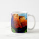Peinture d'une rivière courant à travers un canyon avec de hautes falaises rocheuses et des plantes de yucca au coucher du soleil.