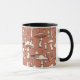 Mug dans un motif de champignons fantaisistes de différentes formes et tailles, dessiné dans un style minimaliste, dessiné à la main, avec une palette crème et marron dressé contre un arrière - plan chaud en terre cuite.