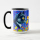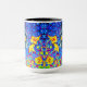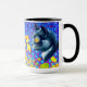 Mug à café avec la peinture animale de Louis Wain Chat en mer de fleurs (1860-1939). Un chat noir et blanc aux yeux dorés sent les fleurs jaunes. Dans l'arrière - plan violet sont des fleurs bleues. Un cadeau merveilleux pour l'art amoureux des chats et anglais.