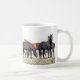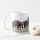 Un dessin photographique d'un troupeau de chevaux qui attendent d'être nourris.
