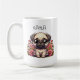Cute chibi dessin douillet petit chien chiot carlin assis dans des fleurs roses avec un nom que vous pouvez ajouter dans l'espace personnalisé.