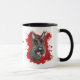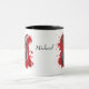 Portrait couleur eau d'un Terrier écossais se distingue par un arrière - plan abstrait de peinture rouge vif. L'image est sur deux côtés de la tasse, avec votre nom ou autre texte personnalisé en noir entre eux.