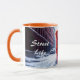 Mug Chien rouge marchant dans la rue d'hiver enneigée