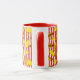 Mug cool imprimé partout avec des hot dogs de francfurter et des pots de moutarde, sur un arrière - plan rayé rouge et blanc. Parfait pour les soirées barbecue et regarder vos jeux de baseball favoris !