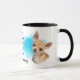 Un beau portrait d'un petit Chihuahua Chig marron est la caractéristique de deux côtés de cette tasse. Chaque image est placée sur un arrière - plan à bec bleu vif. Entre les deux images se trouve le texte qui décrit ce fidèle compagnon avec l'attitude du "grand chien". Le texte en noir sur le bas indique "le chien CHIHUAHUA". Tout le texte est facilement customisé à tout ce que vous préférez ; décrivez votre fidèle petit ami !