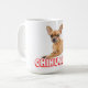 Cette amusante tasse à café canin présente une image d'un gros chihuahua tan d'oreille surligné d'un arrière - plan blanc immaculé avec Chihuahua imprimé en caractères rouges gras.