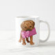 Chiot mignon de puggle tenant l'embrayage rose d'arc dans sa bouche, peinte par l'artiste Maryline Cazenave.