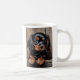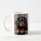 L'image représente le chiot du roi Cavalier Charles Spaniel à la fourrure noire et bronzée. Cavie est assis en rang, regardant directement le spectateur. Le chiot a de grands yeux expressifs et des oreilles moelleuses. L'arrière - plan est un brun doux et flou, créant une atmosphère chaleureuse et accueillante. Le style de peinture est réaliste, saisissant les détails de la fourrure et les caractéristiques des chiots.