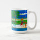 Une belle peinture maintenant sur des 15 onces panoramique. tasse d'un caniche rouge et d'une petite fille, décidant entre l'océan ou leur piscine.