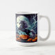 Une licorne noire mystique s'élève dans un champ de citrouilles brillants sous une pleine lune, entourée de chauves-souris et de nuages spectaculaires, créant une atmosphère d'Halloween inquiétante.