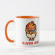 Un poulet à l'air fâché avec l'expression 'gribouiller' sur une tasse de café