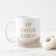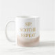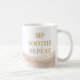 Beach-inspired neutral design featuring a wraparound taupe watercolor wash with gold serif text reading Sip Soothe Repeat. The fluid pattern pairs effortlessly with light wood desks, linen kitchens, or coastal breakfast nooks, making it ideal for daily coffee routines, slow mornings, or evening tea in a refined shoreline setting.