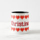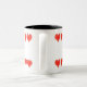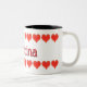 Les coeurs rouges, avec un look 3D, sont alignés en haut et en bas de la tasse. Personnalisez avec le nom en police rouge avec une ombre portée noire.