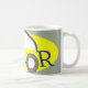 Une tasse pour les amateurs de voiture. Conception d'une voiture abstraite formée à partir des lettres du mot "moteur". Le motif est imprimé en gris jaune et noir.