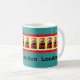 Mug avec le design d'une rangée de bus londoniens - le favori de Routemaster depuis plus de 40 ans - sur un arrière - plan de vert menthe poivrée et les mots Londres répétés trois fois. Dessin de Caroline Webb © 2012.