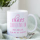 Coordinateur Chaos Typographie rose Personnalisée Coffee Mug présente un design simple du texte "chaos coordinateur (votre nom) alimenté par le café" dans un script amusant de calligraphie rose avec votre nom personnalisé ci-dessous. Personnalisez en modifiant le texte dans la zone de texte fournie. Parfait pour cette maman occupée, enseignant, chef d'équipe sportive ou patron de travail.