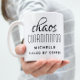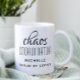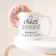 Coordinateur du Chaos Typographie Noire Personnalisé Coffee Mug présente un design simple du texte "chaos coordinateur (votre nom) alimenté par le café" dans un script amusant de calligraphie rose avec votre nom personnalisé ci-dessous. Personnalisez en modifiant le texte dans la zone de texte fournie. Parfait pour cette maman occupée, enseignant, chef d'équipe sportive ou patron de travail.