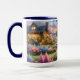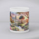 This enchanting artwork captures a dreamy cottage garden bathed in the golden glow of sunset, where colorful blooms and tall foxgloves line a gentle stream that winds past cozy houses and old wooden bridges. A large tree anchors the scene, its sprawling branches casting dappled shadows over the vibrant flowerbeds bursting with lupines, peonies, and wildflowers. Warm lights twinkle along the path, creating a soft, magical ambiance that feels both nostalgic and serene. The pastel tones, painterly brushstrokes, and whimsical composition give the piece a timeless, cottagecore charm—perfect for evoking the peace and poetry of slow-living landscapes. AI generated artwork.