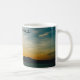 La vue depuis la ville de Thira (Thera) sur la caldera et la mer Egée, avec silhouette des îles de Thirasia et de Nea Kameni ; Santorin, îles des Cyclades, Grèce.
