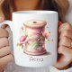 Ce design charmant comporte une bobine de fil avec des fleurs et des feuilles en rose pastel et vert doux. Ce design peut être personnalisé avec un nom à donner à cet amateur de couture spécial dans votre vie comme un cadeau unique pour toute occasion.